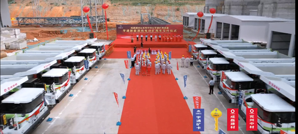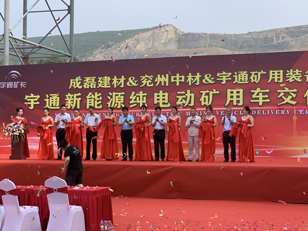 儀式現場彩旗飄飄,人聲鼎沸,場面氣氛熱烈而隆重。首先,宇通礦用裝備銷售公司總經理馬勇先生致詞,馬總介紹了宇通客車響應國家政策在新能源礦車領域擁有的先進技術和取得的市場成就,以及對兗州中材建設有限公司、禹州市成磊建材有限公司美好明天的祝福。隨后,兗州中材建設有限公司副總經理顏景祥先生上臺致詞,顏總強調,兗州中材建設有限公司作為中央企業是更具有社會責任感的企業,兗州中材在謀求發展的同時積極貫徹國家政策,在礦山施工中率先使用新能源設備,為構建“資源節約型、環境友好型”社會做出應有的貢獻,承擔央企責任,擔負央企職責。最后,禹州市成磊建材有限公司總經理張景奇先生致詞,張總肯定了兗州中材建設有限公司在礦山施工中采用更加安全環保新型設備的工作,期望兗州中材建設有限公司依靠過硬的施工技藝、新型的生產設備、高效的管理模式將禹州市成磊建材有限公司礦山在全省乃至全國范圍內樹立標桿,打造成示范性礦山。