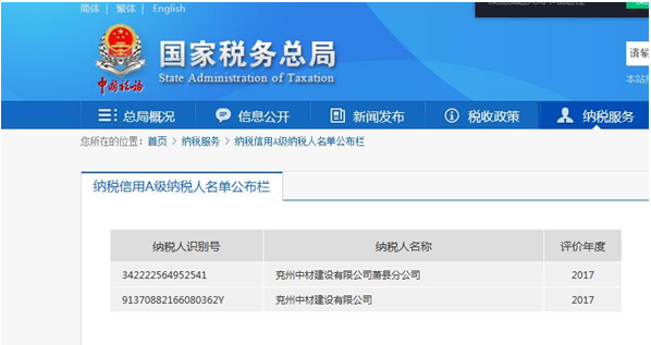 近日,稅務機關組織實施的2017年度納稅信用等級評定結果“出爐”,兗州中材建設有限公司繼2015、2016年度榮獲A級納稅信用企業后,再次榮獲A級納稅信用企業。